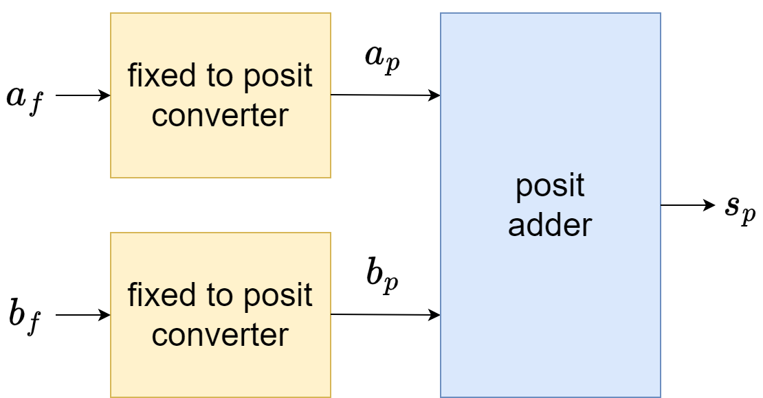 The module (Fig. 1) is fed by two fixed-point numbers, namely af and bf, coverts them into the posit arithmetic [1] format (ap and bp) and sums them to produce a posit output (sp).
