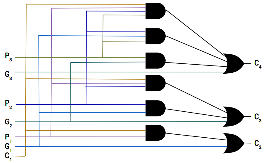 The calculations for the propagate, generate, and sum signals are trivial, but the calculation for the carry bit is dependent on its value in the previous bit, which makes it more complicated to solve. For example, all of the carry bits in a 4-bit CLA adder can be seen in the equation and diagram below: