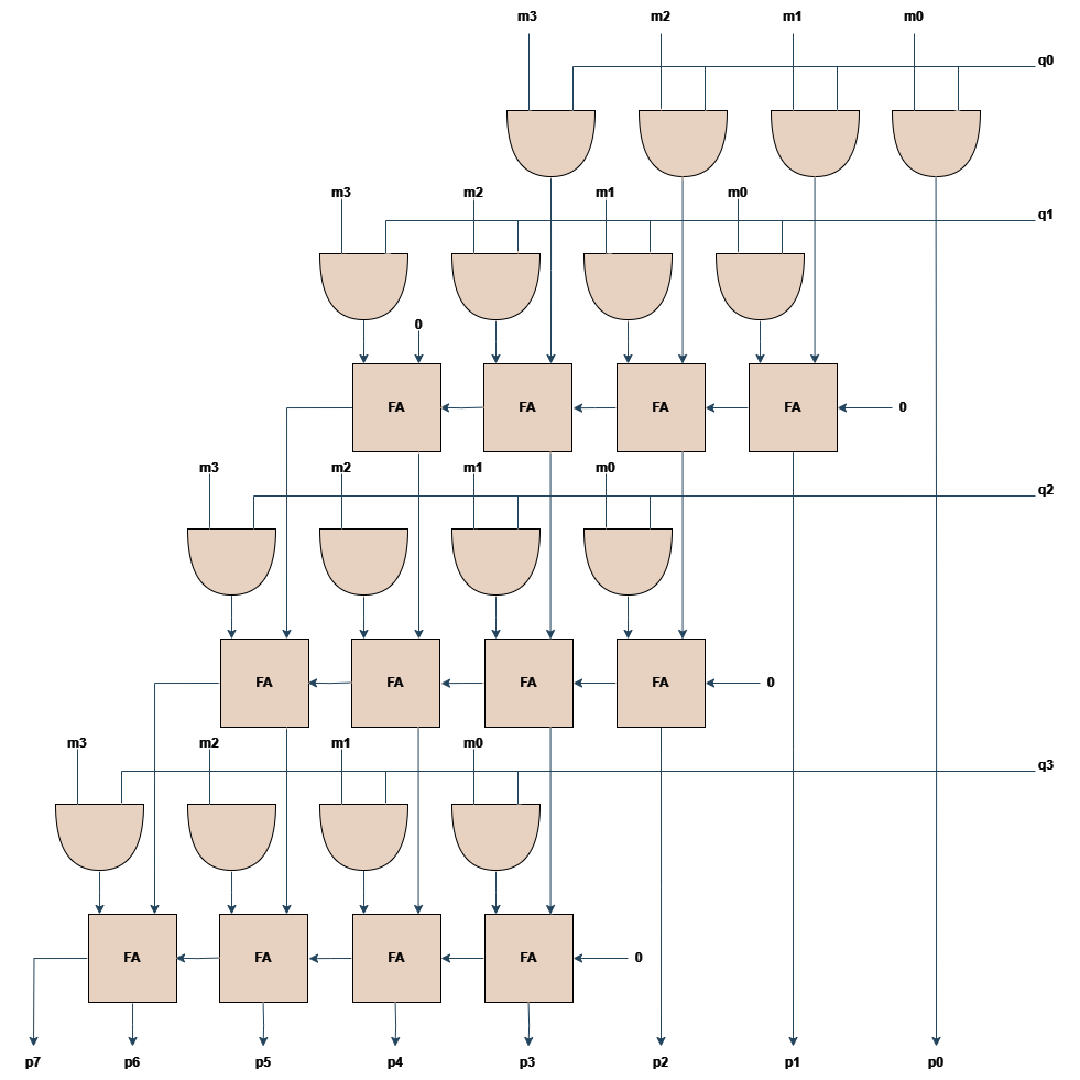 This is a array multiplier to multiply two 4-bit binaries. It uses full adders to process bitwise multiplications, the circuit diagram is as shown below:
