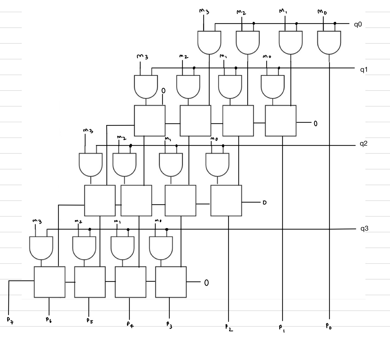 This is a 4x4 array muliplier that takes in two 4-bit factors, m and q, and uses a full adder to output an 8-bit product of m and q, p.