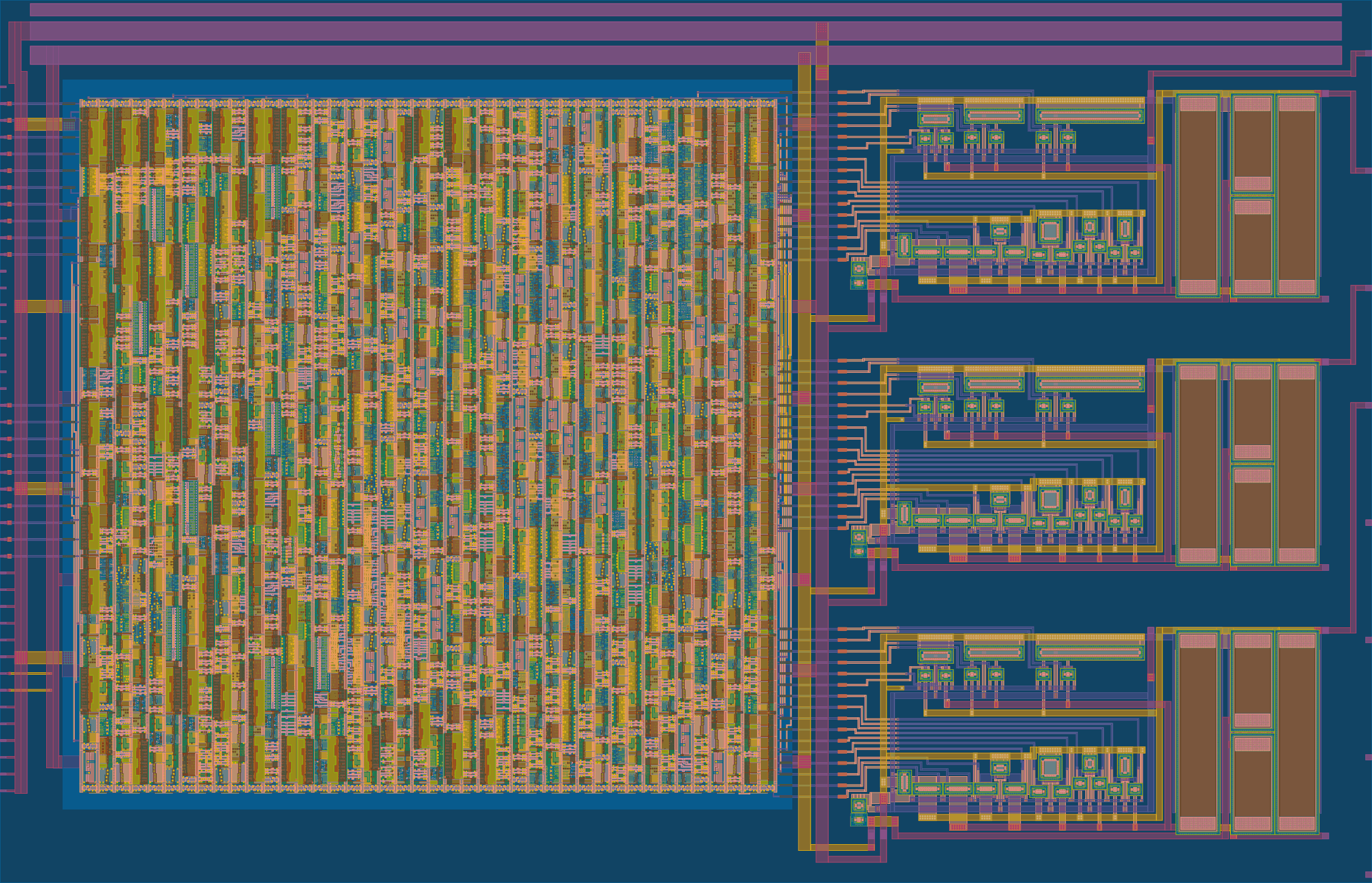 This project (tt08-vga-fun) uses (roughly-designed) current steering DACs to hopefully produce analog outputs that can produce an adequate RGB888 (24-bit) VGA image, based on patterns that can be generated from a simple digital controller. This improves on my previous tt06-grab-bag -- my 1st analog ASIC project, included on TT06, using 3 RDAC instances instead.