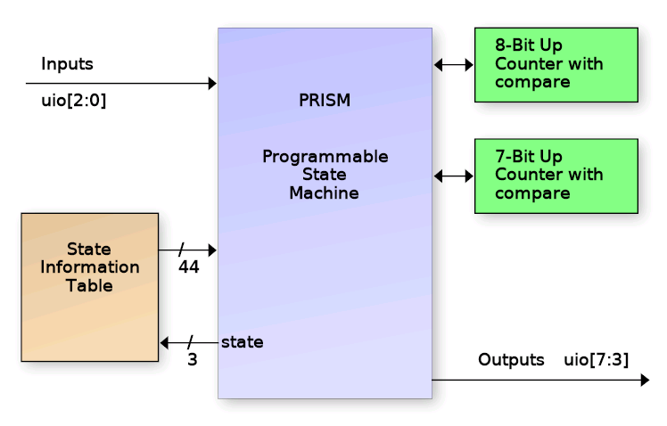 PRISM (Programmable Reconfigurable Indexed State Machine) is a block that executes a Verilog-coded Mealy state machine loaded via a runtime loadable configuration bitstream generated by a custom branch of Yosys. PRISM includes it's own counter and compare sub-peripheral for performing timing operation as well.