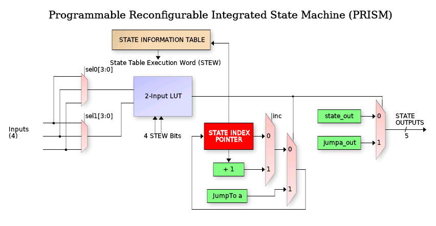 Once a chroma has been loaded, the control register programmed and the PRISM enabled, the FSM will start at state 0. Eight of the bits in the State Execution Word (STEW) specify which of 16 inputs get routed to the 2-input Look Up Table (LUT) that makes the decision for jumping to the specified state (stored in 3 bits of the STEW). While in any state, there is a set of 11 (from the STEW) output bits that drive the PRISM block outputs when the LUT output is zero (no jump) and 11 more that are output during a jump (transitional outputs).