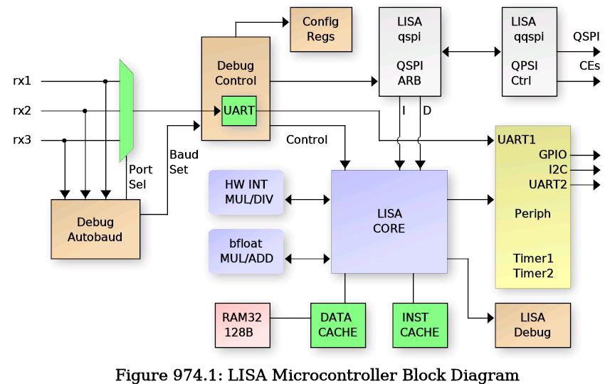 LISA is a Microcontroller built around a custom 8-Bit Little ISA (LISA) microprocessor core. It includes several standard peripherals that would be found on commercial microcontrollers including timers, GPIO, UARTs and I2C. The following is a block diagram of the LISA Microcontroller: