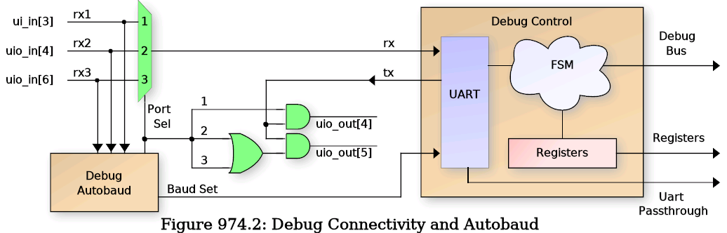 The RX/TX pair port is auto-detected after reset by the autobaud circuit, and the UART baud rate can either be configured manually or auto detected by the autobaud module. After reset, the ui_in[7] pin is sampled to determine the baud rate selection mode. If this input pin is HIGH, then autobaud is disabled and ui_in[6:0] is sampled as the UART baud divider and written to the Baud Rate Generator (BRG). The value of this divider should be: clk_freq / baud_rate / 8 - 1. Due to last minute additions of complex floating point operations, and only 2 hours left on the count-down clock, the timing was relaxed to 20MHz input clock max. So for a 20MHz clock and 115200 baud, the b_div[6:0] value would be 42 (for instance).