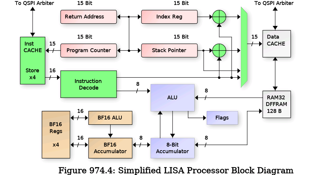 It uses a 32x32 1RW DFFRAM macro to implement a 128 bytes (1 kilobit) RAM module. The 128 Byte ram can be used either as a DATA cache for the processor data bus, giving a 32K Byte address range, or the CACHE controller can be disabled, connecting the Lisa processor core to the RAM directly, limiting the data space to 128 bytes. Inclusion of the DFFRAM is thanks to Uri Shaked (Discord urish) and his DFFRAM example.