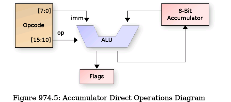 To do any useful work, the LISA core must be able to load and operate on data. This is done through the accumulator using the various addressing modes. The diagram below details the Direct addressing mode where data is stored directly in the opcode / instruction word: