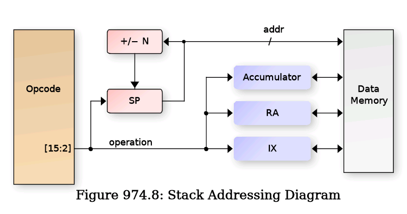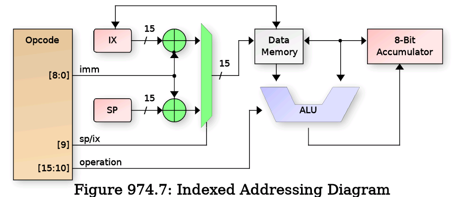 Indexed operations use either the IX or SP register plus a fixed offset from the immediate field of the opcode. The selection to use IX vs SP is also from the opcode[9] bit. The immediate field is not sign extended, so only positive direction indexing is supported. This was selected because this mode is typically used to access either local variables (when using SP) or C struct members (when using IX), and in both cases, negative index offsets aren't very useful. The following is a diagram of indexed addressing: