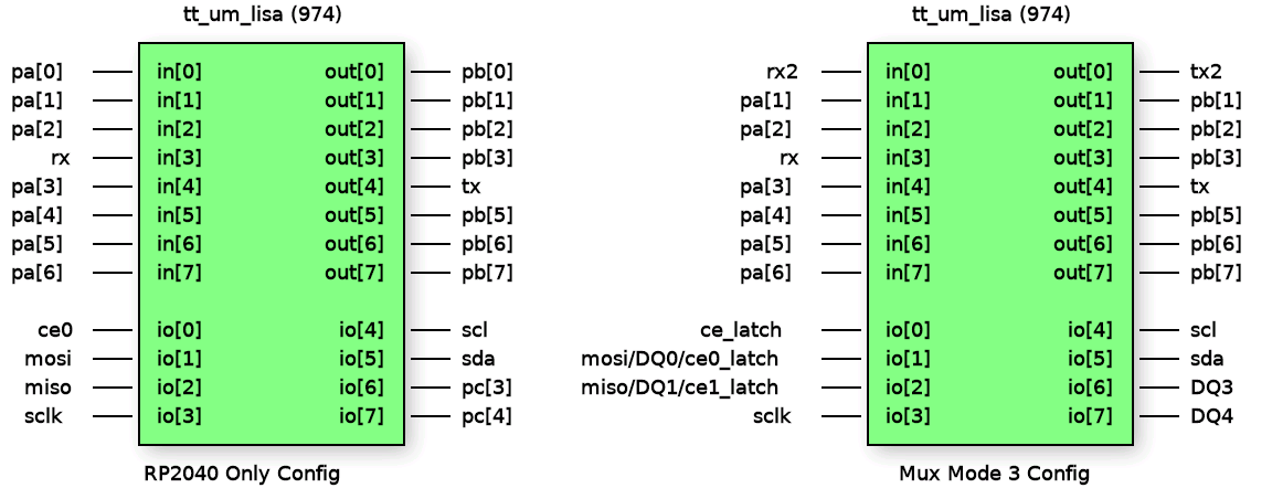 Before the LISA microcontroller can be used in any meaningful manner, a SPI / QSPI SRAM (and optionally a NOR FLASH) must be connected to the Tiny Tapeout PCB. Alternately, the RP2040 controller on the board can be configured to emulate a single SPI (the details for configuring this are outside the scope of this documentation ... search the Tiny Tapeout website for details.). For the CE signals, there are two operating modes, fixed CE output and Mux Mode 3 "latched" CE mode. Both will be described here. The other standard SPI signals are routed to dedicated pins as follows: