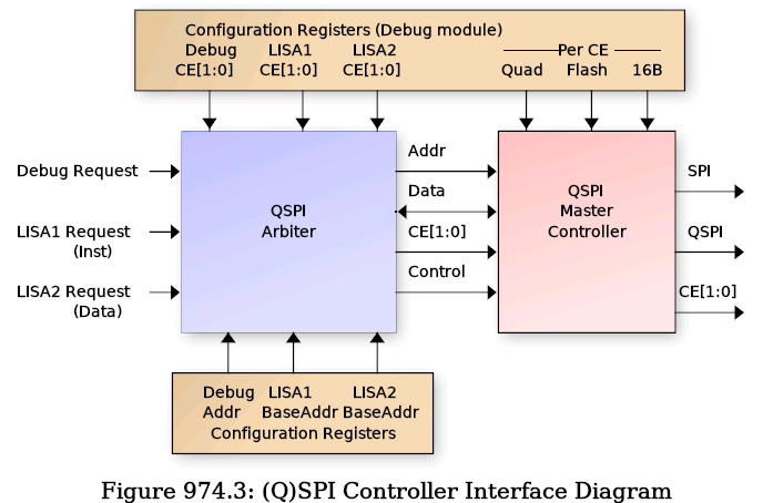 When the arbiter chooses a requestor, it passes its programmed CE selection to the QSPI controller. The QSPI controller then uses the programmed QUAD, MODE, FLASH and 16B settings for the chosen CE to process the request. This allows LISA1 (Instruction) to either execute from the same SRAM as LISA2 (Data) or to execute from a separate CE (such as FLASH with permanent data storage).