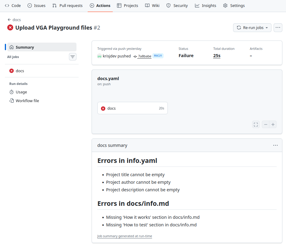 docs: Compile your project documentation into a PDF - uses content in info.yaml and docs/info.md.gds: Generate the GDS for your project and shows you some interesting information.test: Uses test.py to automatically test your design with CocoTB.fpga: Create an FPGA bitstream to upload your design onto an FPGA.You only need to have docs and gds passing (lit up green) in order to submit your design.