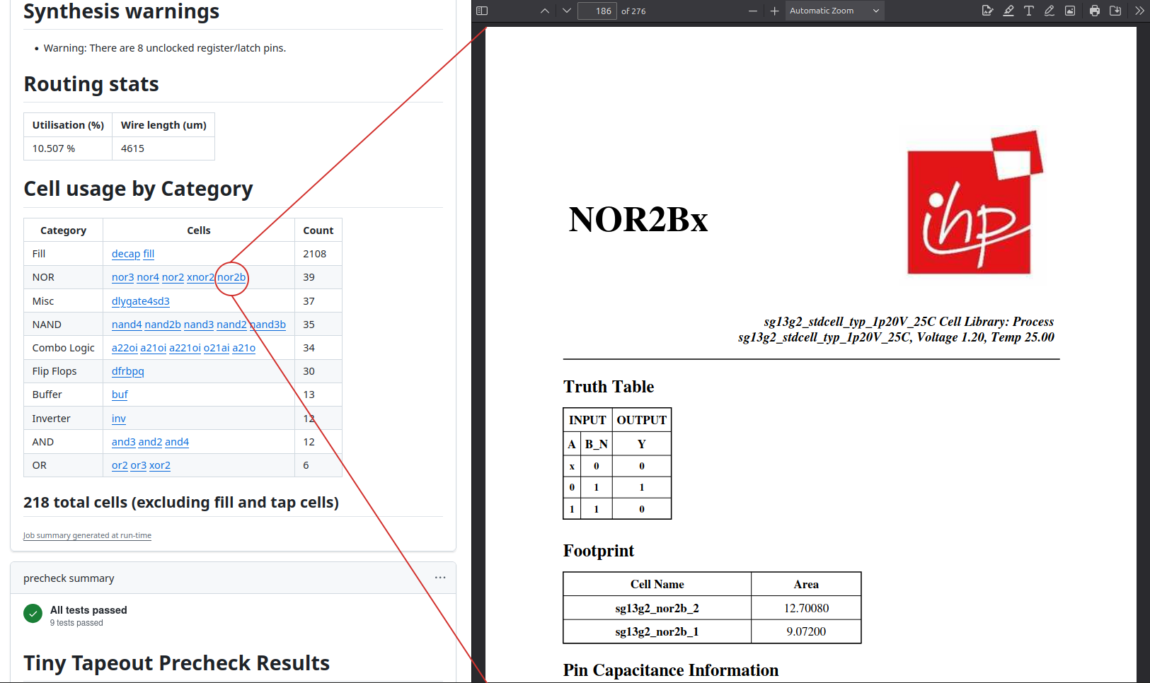 Take a look at the standard cell usage summary. These cells are a part of the PDK provided by IHP. The details of each cell can be viewed by clicking the links.