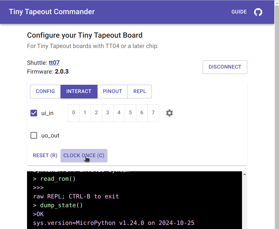 ui_inIf you need to send a stream of input, it’ll be necessary to script something up, but for setting initial state of the inputs to some known and valid value, the ui_in option is ideal. Set this value to an integer and the various input bits will be set accordingly.