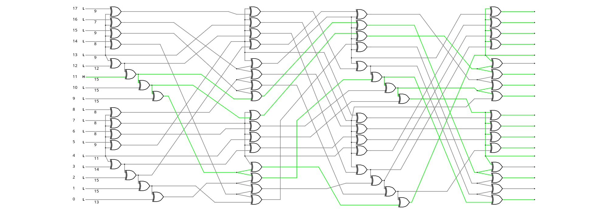 Conveniently, the same sea-of-XOR is identical, both for encoding and decoding, and the decoding side is "recursive" such that it amplifies any transmission error at the receiving end. The sorted avalanche for a single bitflip is : 7 8 8 8 8 9 9 9 9 1 12 13 14 15 15 15 15 15 (total=200). The 64 XOR2 gates have a propagation delay of 10 gates, yet the effective latency in the system is just one XOR in the critical datapath:
