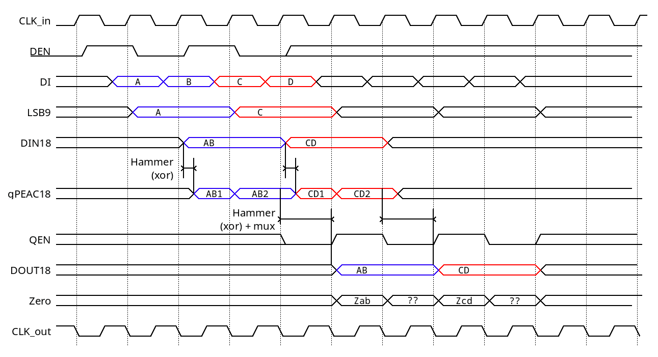 - The Zero output is always active (encoding as well as decoding) but gives a valid result only when QEN is asserted. It does only check the data bits: [7:0] and [17:9], conveniently mapped to the output byte pins.