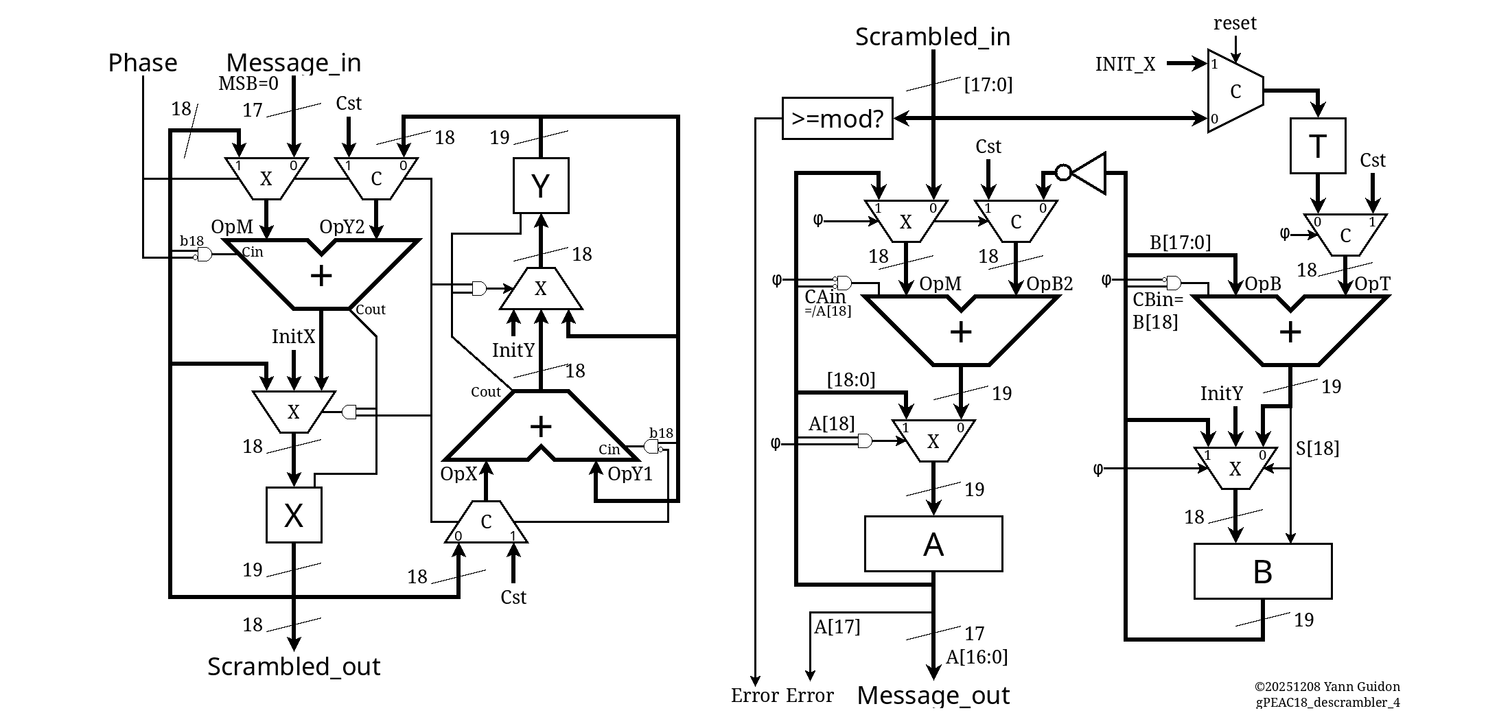 These very different types of circuits are complementary, together they provide very strong scrambling, eliminate problems inherent with classical LFSRs, and detect errors very early. With an equivalent of 56 bits of state and uncrashable mathematics, the system remains fast, compact and tailored for safety and early retransmission to save bandwidth/latency and reduce buffer sizes (and cost).