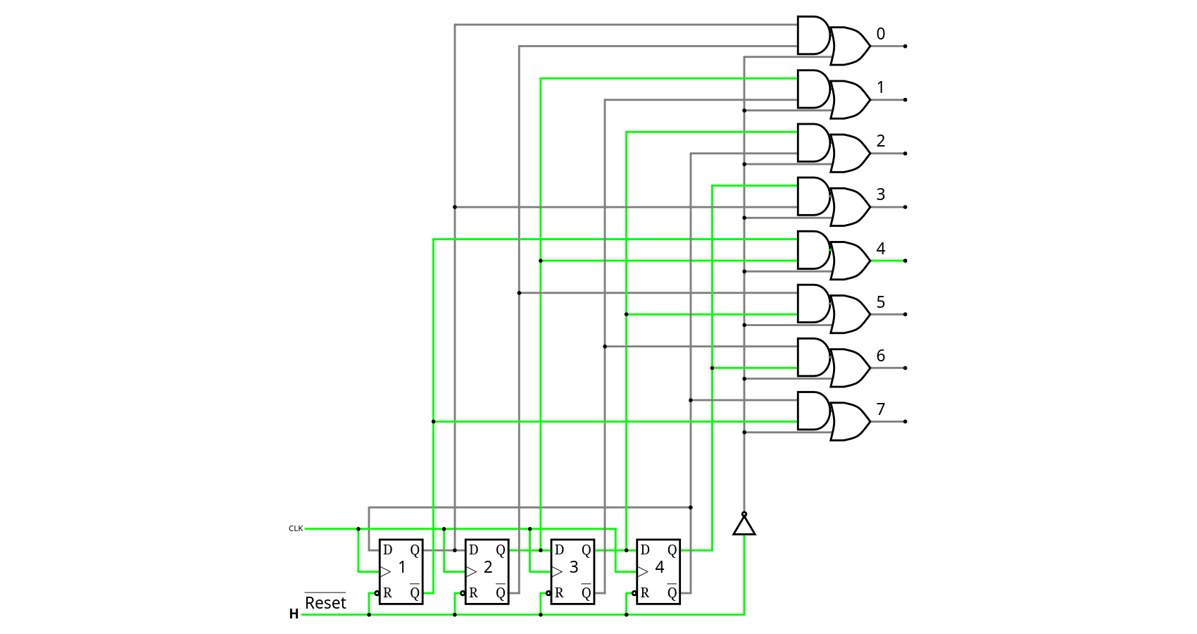 • 4 output pins provide the internal state of that 4-bit Johnson counter, or ring counter, thus you should observe a pretty pattern where only one pin changes at each clock cycle. Note in the diagram above that RESET forces all the outputs to 1, thus flushing the whole delay line in less than a microsecond.