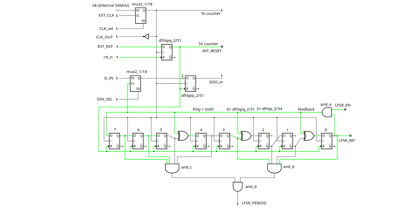 • Connect an oscilloscope to probe the signals D_OUT and LFSR_BIT while triggering on LFSR_PERIOD (which pulses every 255 clock cycles)
