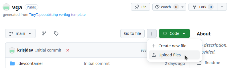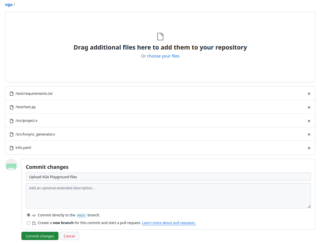You’ll need to download your modified VGA project from VGA Playground, and upload it to GitHub to begin preparing for submission. You may either commit these files via git from the terminal, or upload them directly to GitHub through the website interface - choose whichever you’re most comfortable with.