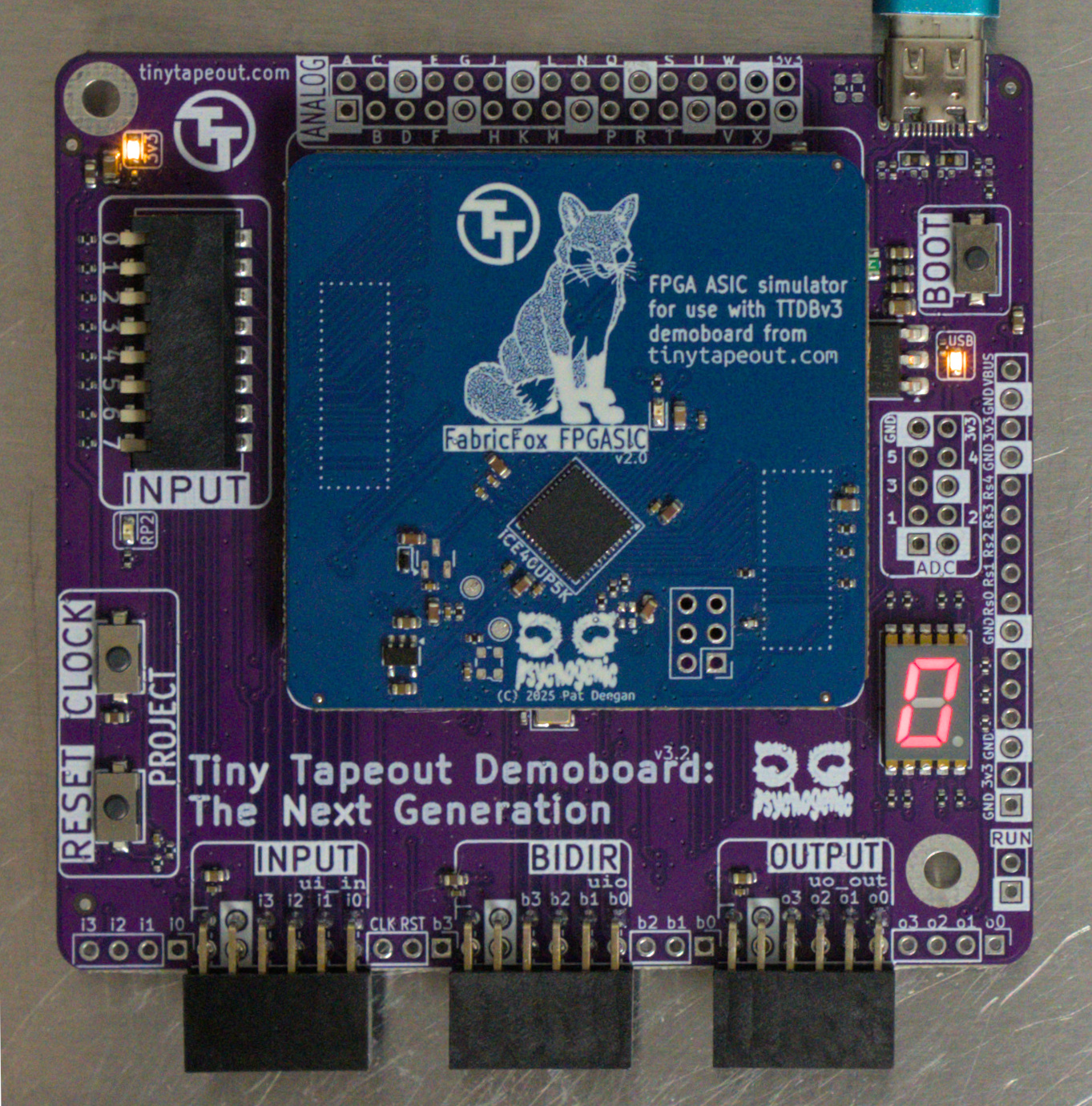 The FPGA breakout has a Lattice UP5K FPGA on a PCB with headers and a pinout compatible with the Tiny Tapeout demoboard, which includes all the digital I/O as well as the project reset and clock (both routed to global buffer input pins on the FPGA).