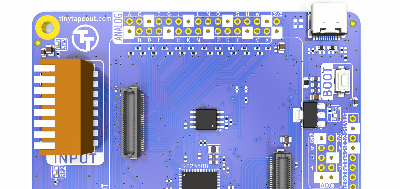 Five of the RP2350’s ADCs are also exposed through another header, the 5x2 100mil header seen towards the bottom right in the image above, along with a number of ground pins and one 3v3 supply, for convenience. You could do things like put a jumper between some analog pin at the top to an ADC and interact with the project programatically using microPython. This is left as an exercise for the reader.