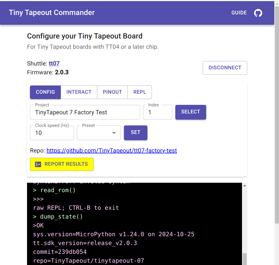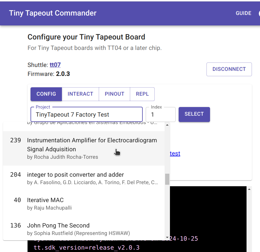 With the shuttle being set to tt07 (or whichever chip you actually have on hand). Some debug output is visible in the black box at the bottom, where you can glean more info, such as the SDK release detected.